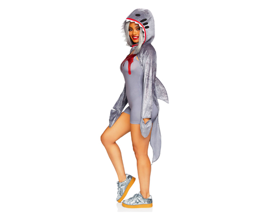 2 Delig Sexy Haai kostuum, bestaande uit een romper met druipend bloed van glitters en een fluwelen vest met hoodie met een fin aan de achterkant en mouwen met handschoenen